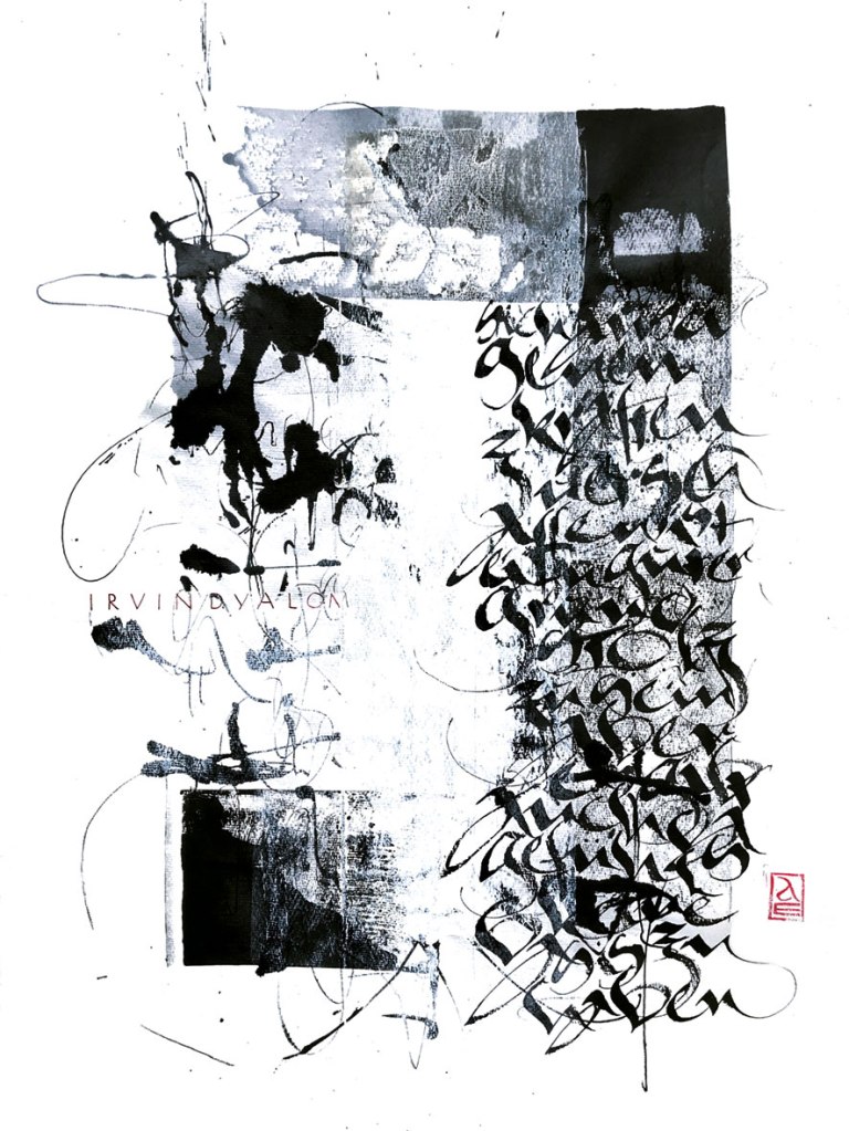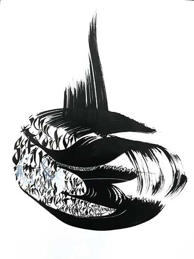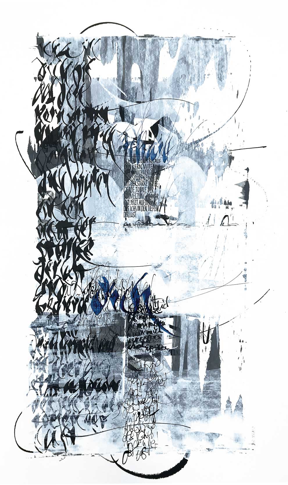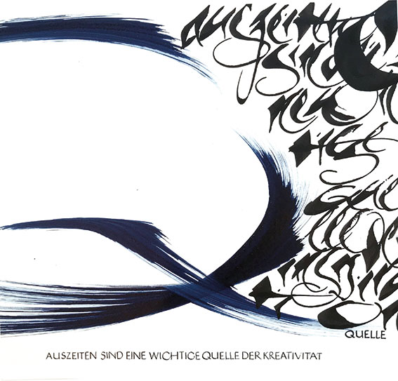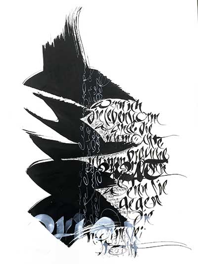 Schriftbilder sind geschriebene Bilder. Durch die kalligrafische Gestaltung eines Wortes oder Textes hebe ich diesen von der rein inhaltlichen in die bildhafte, emotionale Ebene empor und verlasse damit die sachliche Ebene. Das kalligrafierte Schriftbild transportiert entweder Assoziationen und Emotionen, die beim Lesen und Erfassen des Wortes oder Textes in mir als Künstlerin ausgelöst wurden oder aber es ist die Verbildlichung der assoziierten Metaphern des Autors oder Dichters. Die Gestaltung eines komponierten Schriftbildes gleicht einem virtuosen Zusammenspiel von Farben, Proportionen, Schreibwerkzeug, Schriftart, Schriftgößen, Zeilenabstand und Papierqualität und bettet sich ein in eine große Gesamtkomposition.